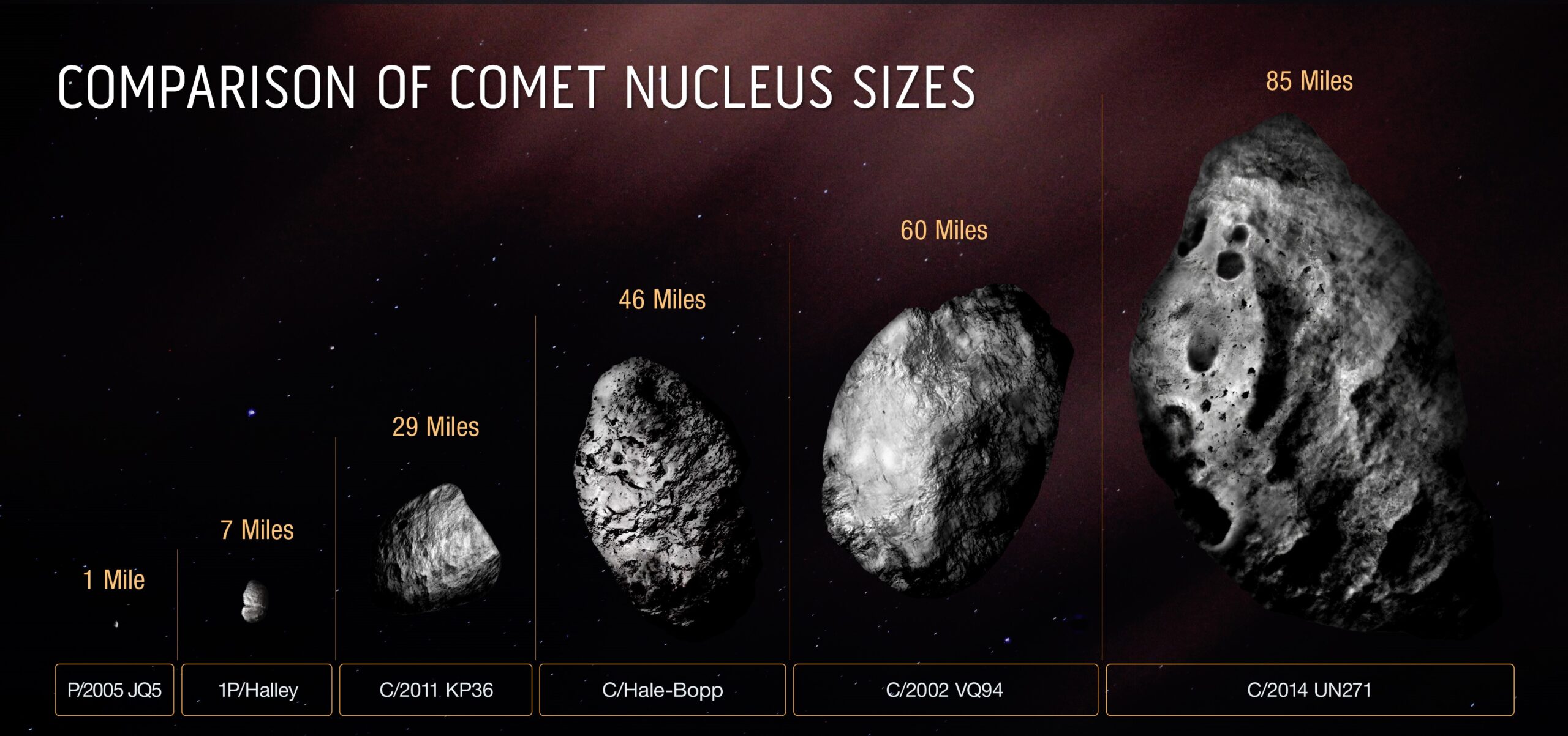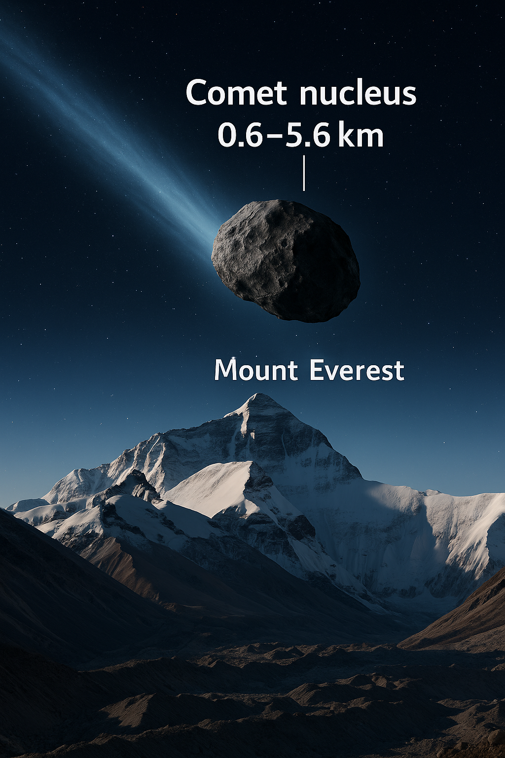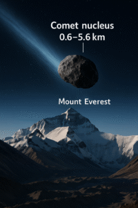 Inizialmente le dimensioni di 3I/ATLAS erano state nettamente sovrastimate: al momento della scoperta si pensava a un oggetto enorme, forse tra i più grandi mai visti provenienti dallo spazio interstellare. Tuttavia, le osservazioni ad alta risoluzione effettuate successivamente dal telescopio spaziale Hubble hanno raccontato una storia molto diversa e più coerente con i modelli cometari conosciuti. Le stime aggiornate indicano infatti un nucleo compreso tra 0,6 e 5,6 chilometri di diametro (0,37–3,48 miglia), perfettamente nella norma per una cometa attiva di questo tipo.