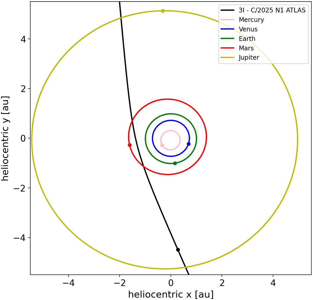 Nessun pericolo. 3I/ATLAS attraverserà la parte interna del nostro sistema planetario, ma si manterrà a grande distanza dalla Terra. Il suo punto di massimo avvicinamento sarà attorno a 1,8 UA — cioè circa 270 milioni di km, quasi il doppio della distanza media Terra-Sole.